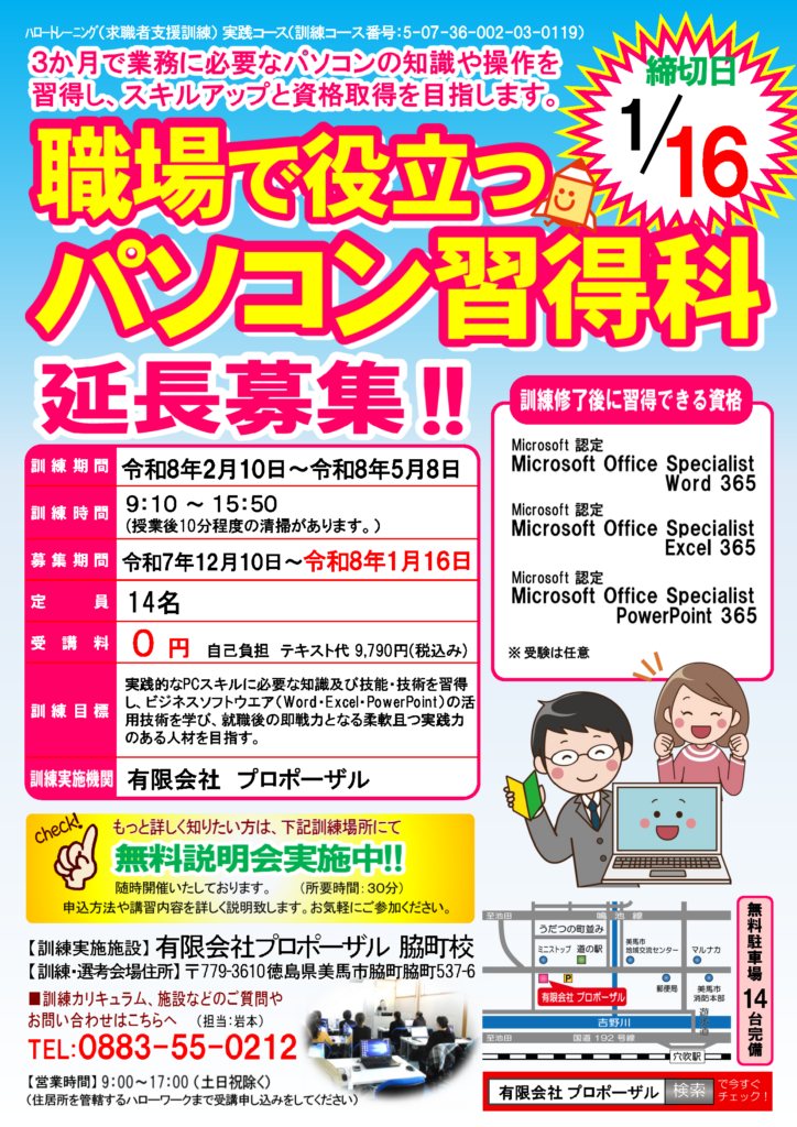 2025年10月29日 / 最終更新日時 : 2026年1月20日 proposal 求職者支援訓練 訓練生募集終了! 職種や業種を問わずパソコンを効率的に活用し、幅広く対応できる時代に即した職業人を目指します。 ※詳しい内容は上のチラシ画像をクリックしてください。 訓練期間 令和8年2月10日~令和8年5月8日 募集期間 令和7年12月 […]