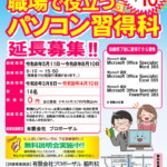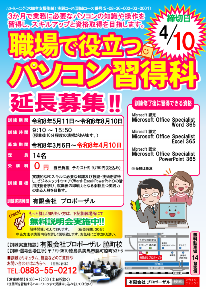 2025年5月15日 / 最終更新日時 : 2026年2月20日 proposal 求職者支援訓練 訓練生募集終了!! 職場で役立つパソコン習得科 パソコン未経験でも基本操作を学び、応用力を養うことができます。 「基礎から」「しっかり」「着実に」仕事に必要なスキルを身につけ、ビジネスソフトウエア(Word、Excel、PowerPoint […]