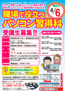 「基礎から」「しっかり」「着実に」仕事に必要なスキルを身につけ、ビジネスソフトウエア(Word、Excel、PowerPoint)の基本操作や簡易なWEBページ作成を学ぶことができます!!